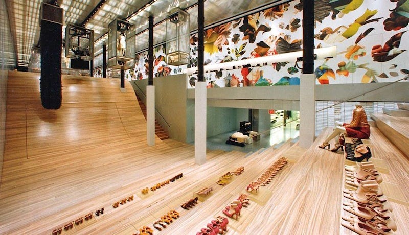 And this rabbit hole reminded me of another store that completely blew my mind when I first saw it: the Prada Epicenter in Soho. My brother took me there when I was a teenager, probably not long after it opened, and I remember standing in front of that enormous wave-like staircase in the middle of the store with a very strong urge to slide down it. This Instagram reel will give you all the early 2000s feels with the “high-tech” features of the store.