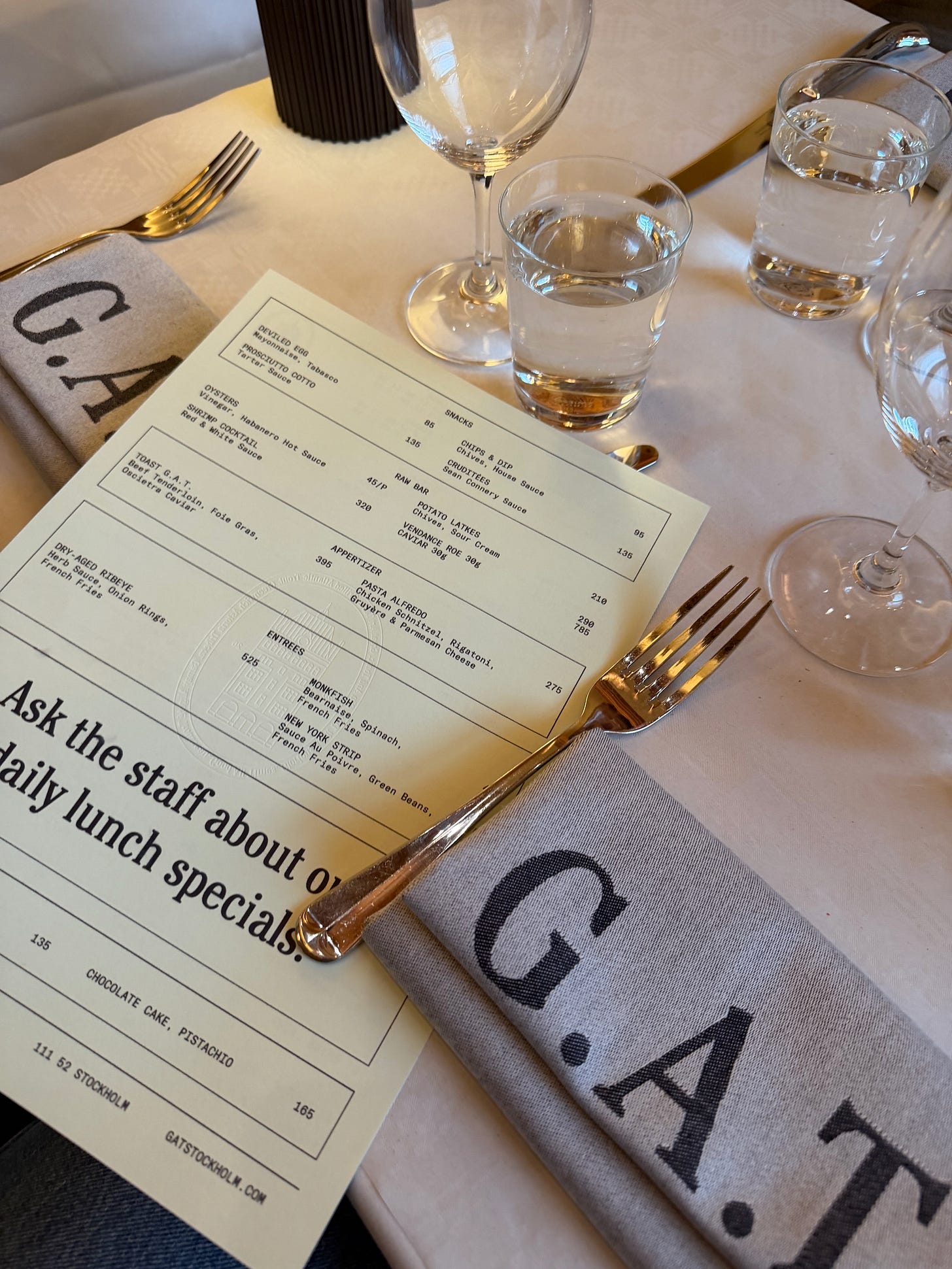 On my actual birthday we had lunch at G.A.T., Stockholm’s newest restaurant hot spot right across from the Royal Swedish Opera. The name is simply shorthand for Gustav Adolfs Torg, the square it sits on, and the concept is a New York–style bistro with a French menu. It was such a lovely, relaxed lunch with my husband and son (the other two were at school), and now I’m already looking forward to going back one evening for dinner and one of their viral cocktails.