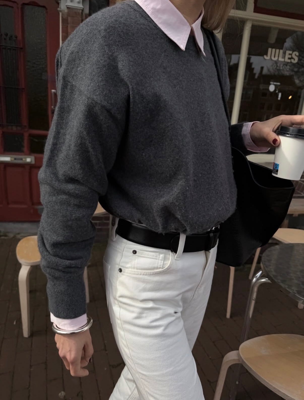 Yesterday, Linda Tol posted a photo of her wearing a light pink shirt under a grey crewneck with white jeans, a black belt, and red nails and I have not stopped thinking about it. Are you kidding me? Yes please. Thank you. Vinted gods, I am now officially searching for a pink shirt. I regularly nerd out over Linda’s styling like I did here because she has that rare ability to make the simplest combinations feel incredibly intentional.